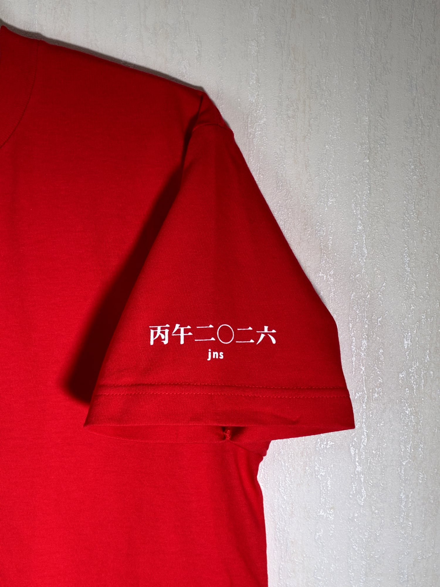 還暦祝い用に、赤のTシャツの左袖に2026年の干支と漢数字の組み合わせ「丙午二〇二六」をデザインしたjnsオリジナルTシャツです。1966年(昭和41年)生まれの方の還暦をお祝いする特別な日だけではなく、普段着としても使える、控えめなデザインのTシャツです。サイズは女性向けのWM,WLと、男性向けのS,M,Lをご用意しました。